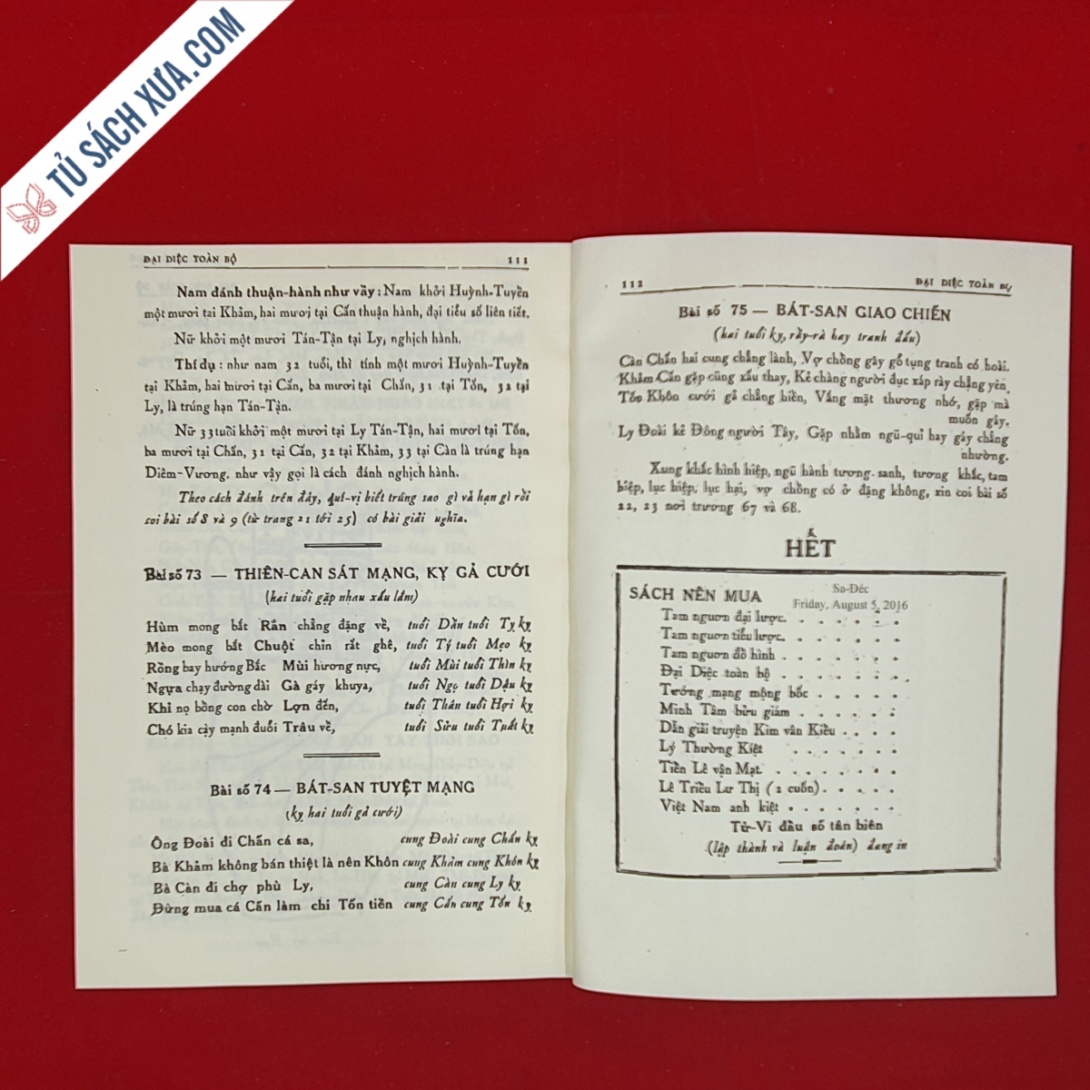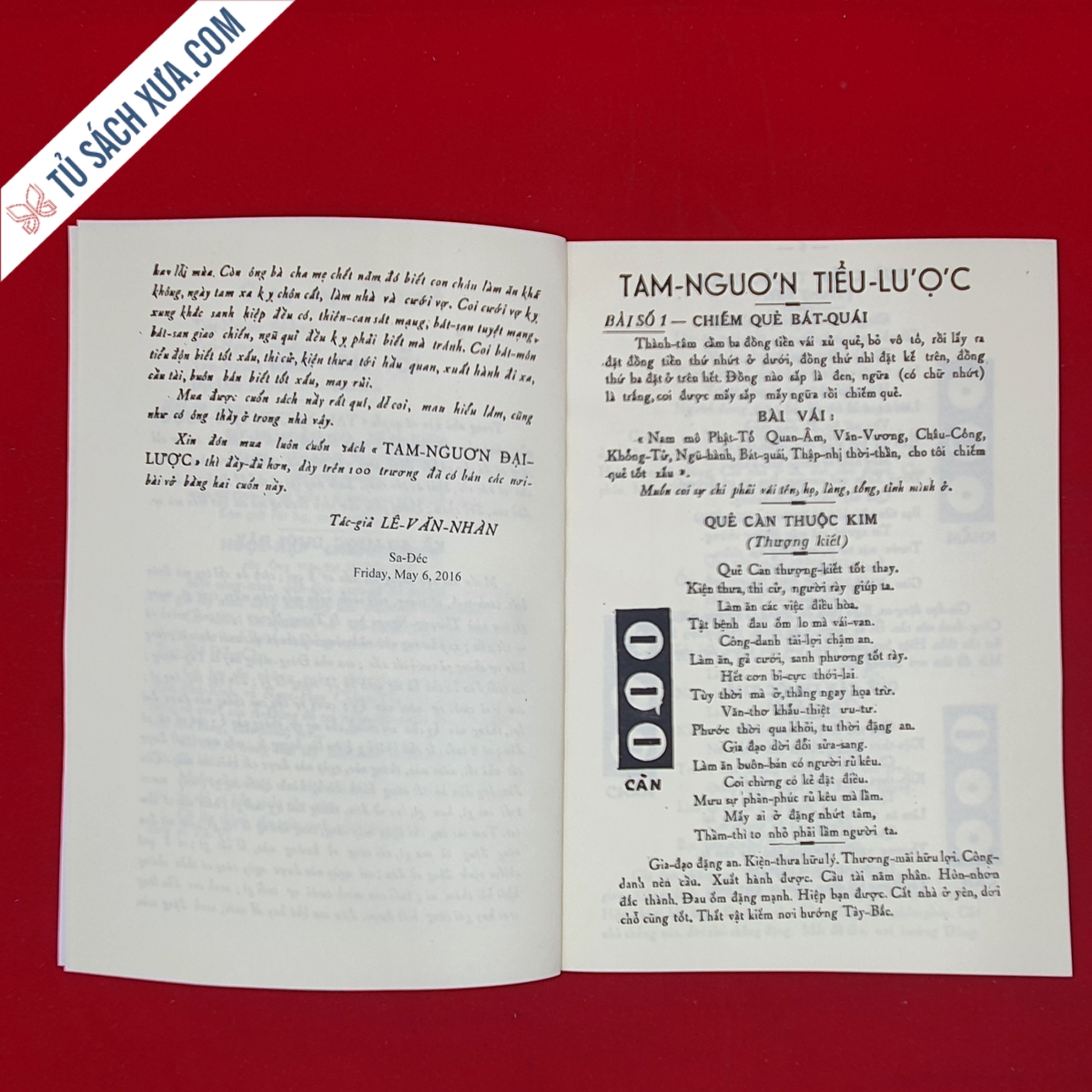 Quyển sách này nên mua, coi biết số mạng đời người nghèo giàu cực, sướng, tánh tình nam nữ thế nào, có 6 bàn tay kim lâu, hoan ốc đánh coi năm mấy mươi tuổi cất nhà đặng tốt xấu, bàn tay tam xa sát, thiên tảo địa tảo, thiên băng địa hãm, bàn tay thiên can đại độn tính thành quẻ hay lắm, có 100 quẻ xâm, giải nghĩa rành rẽ tốt xấu, và coi 60 ngày xuất hành đi xa kiết hung.