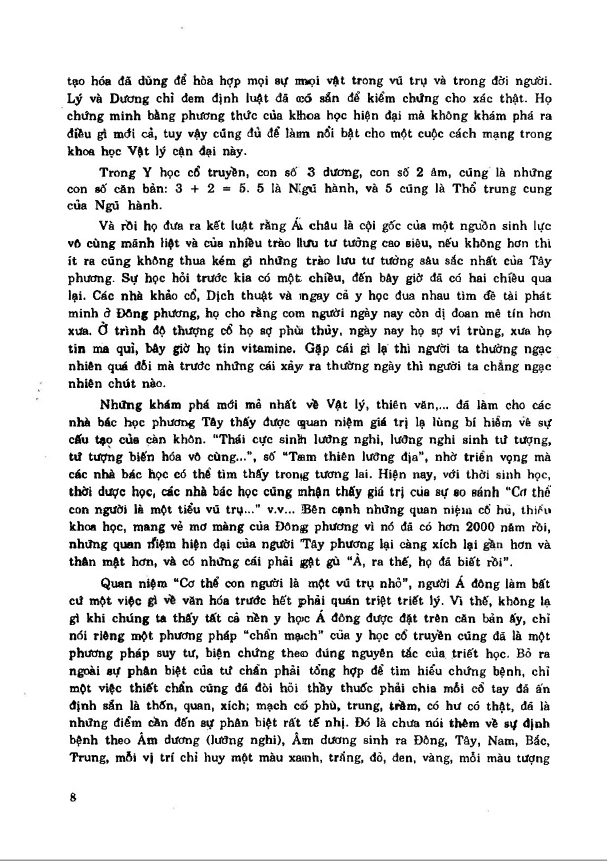 Quan niệm “Cơ thể con người là một vũ trụ nhỏ“, người Á Đông làm bất cứ một việc gì về văn hóa trước hết phải quán triệt triết lý. Vì thế, không lạ gì khi chúng ta thấy tất cả nền y học Á Đông được đặt trên căn bản ấy, chi nói riêng một phương pháp “chẩn mạch” của y học cổ truyền cũng đã là một phương pháp suy tư, biện chứng theo đúng nguyên tắc của triết học. Bỏ ra ngoài sự phân biệt của tư chẩn phải tổng hợp để tìm hiểu chứng bệnh, chỉ một việc thiết chẩn cũng đã đòi hỏi thầy thuốc phải chia mỗi cổ tay đã ấn định sẵn là thốn, quan, xích; mạch cổ phù, trung, trầm, có hư có thật, đs là những điểm cần đến sự phân biệt rất tế nhị. Đó là chưa nói thêm về sự định bệnh theo Âm dương (lưỡng nghi), Âm dương sinh ra Đông, Tây, Nam, Bắc, Trung, mỗi vị trí chỉ huy một màu xanh, trắng đỏ, đen, vàng, mỗi màu tượng trưng cho một mùa Xuân, Hạ, Thu, Đông và Tứ Qúi, và cố nhiên điều hành 5 khí Mộc, Hỏa, Thổ, Kim, Thủy mà trong đó là Can thuộc Mộc, Tâm thuộc Hỏa, Tỳ thuộc Thổ v.v…