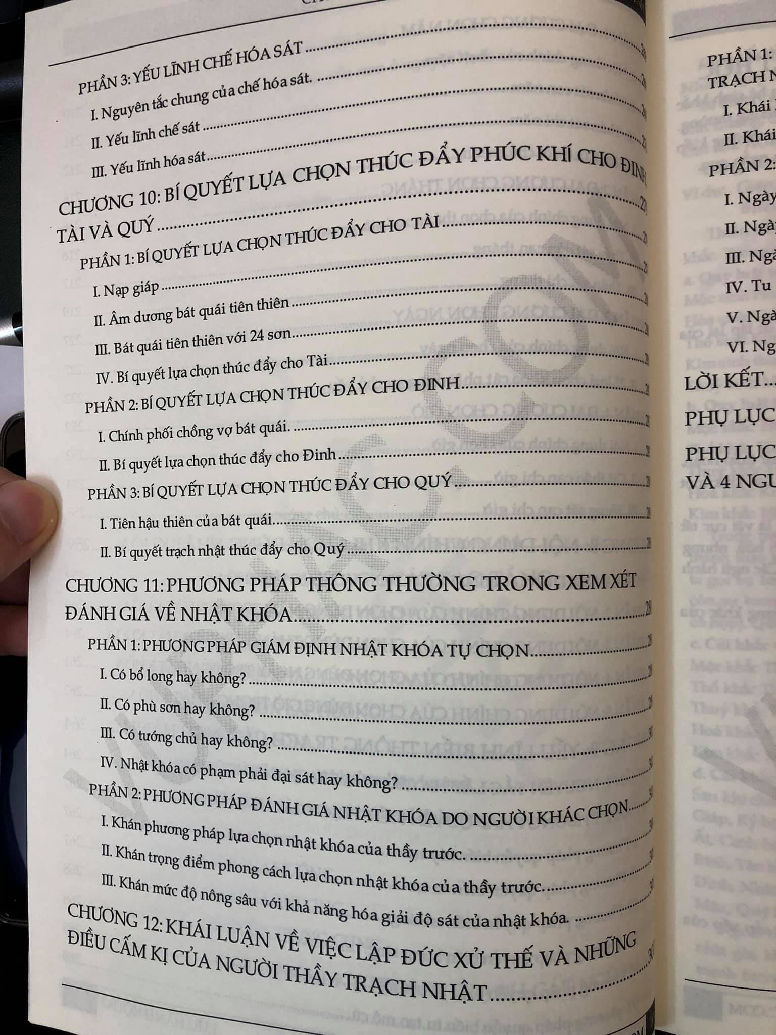 *Nội dung chính: sách trình bày đầy đủ các khái niệm về chính ngũ hành, các đại thần sát và đại hung sát thường dùng (hôn nhân giá thú được tác giả viết ở 1 cuốn riêng – dĩ nhiên hệ thống thần sát cũng có khác biệt). Các khái niệm về dụng thần, bổ long-phù sơn-tướng chủ là gì? thực hiện ra làm sao? yếu lĩnh khi chọn nhật khoá? Cách thẩm định 1 nhật khoá là như thế nào? Các điều kiêng kị cần tránh khi chọn nhật khoá? Tất cả đều được tác giả trình bày rất chi tiết, cụ thể.