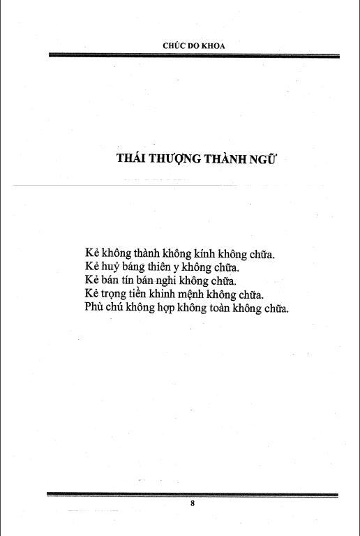 Thời thái cổ, các bậc tiên hiền truyền nhau mười ba khoa y dược để trị bệnh. Chúc do khoa là bí kíp phù chú của Hiên Viên Hoàng Đế nhằm trị mọi chứng bệnh của nam nữ. Bệnh thì phải theo bác sĩ để mà trị nhưng nếu không được thì cần dùng sách này để phụ tá thì việc điều trị theo y học hiện đại sẽ rất có hiệu quả. Người có bệnh khẩn cẩu với trời, kể rõ mọi việc, nên gọi CHÚC DO là như vậy. Y thuật lưu truyền không thiếu, duy có khoa này ít thấy, kẻ ngu si thì bảo đây là thuyết yểu mạng hay sự dị đoan, mà không hay rằng đây là di giáo của thánh hiền truyền lại từ thời thượng cổ.