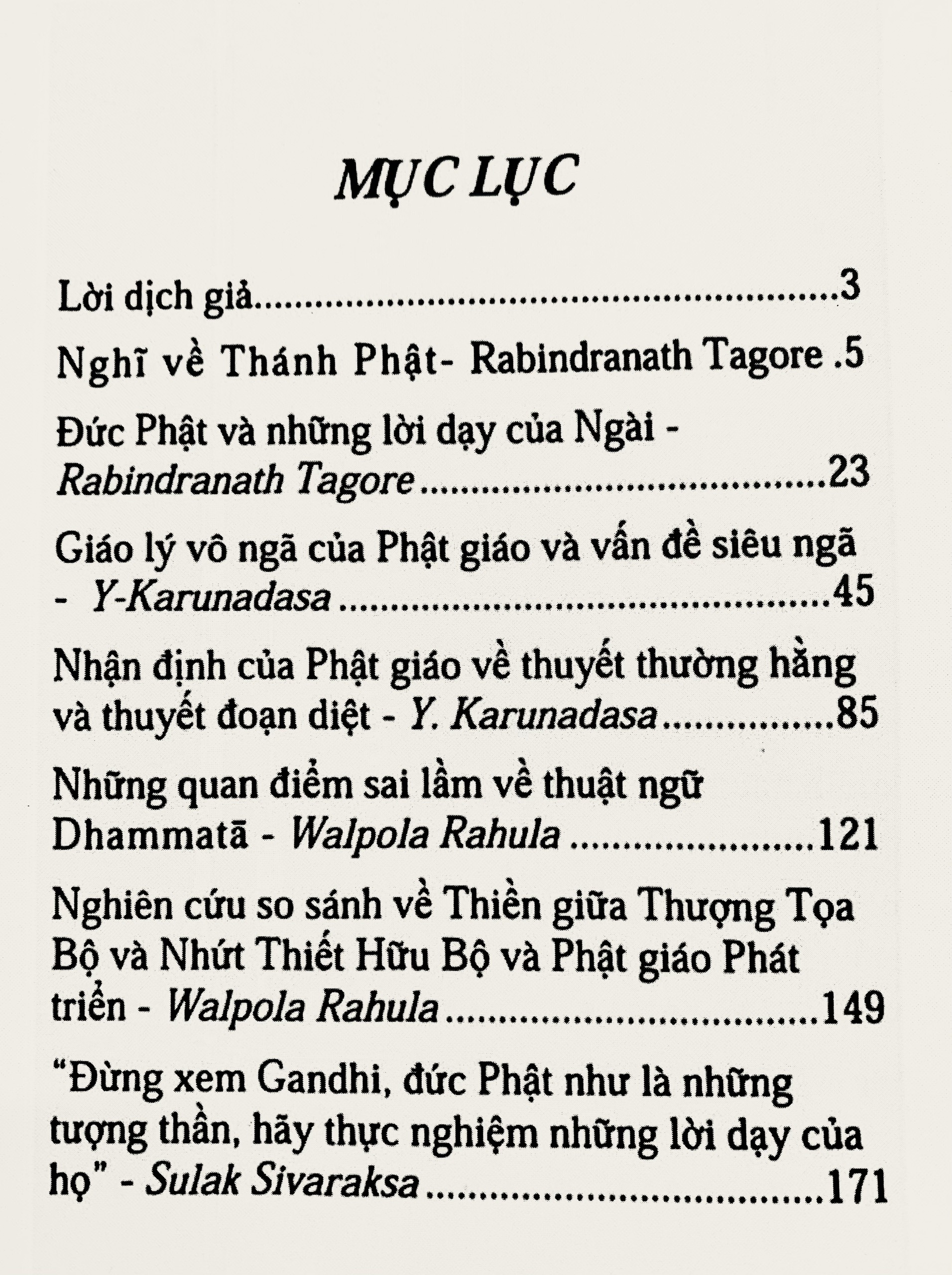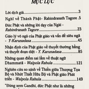 Nội dung cuốn sách bao gồm: Nghĩ về thánh Phật – Đức Phật và những lời dạy của Ngài – Giáo lý vô ngã của Phật giáo và vấn đề siêu ngã – Nhận định của Phật giáo về thuyết thường hằng và thuyết đoạn diệt – Những quan điểm sai lầm về thuật ngữ dhammatā – Nghiên cứu so sánh về Thiền giữa Thượng tọa bộ, Nhứt thiết hữu bộ và Phật giáo phát triển – Đừng xem Gandhi, đức Phật như là những tượng thần, hãy thực nghiệm những lời dạy tượng thần, hãy thực nghiệm những lời dạy của họ