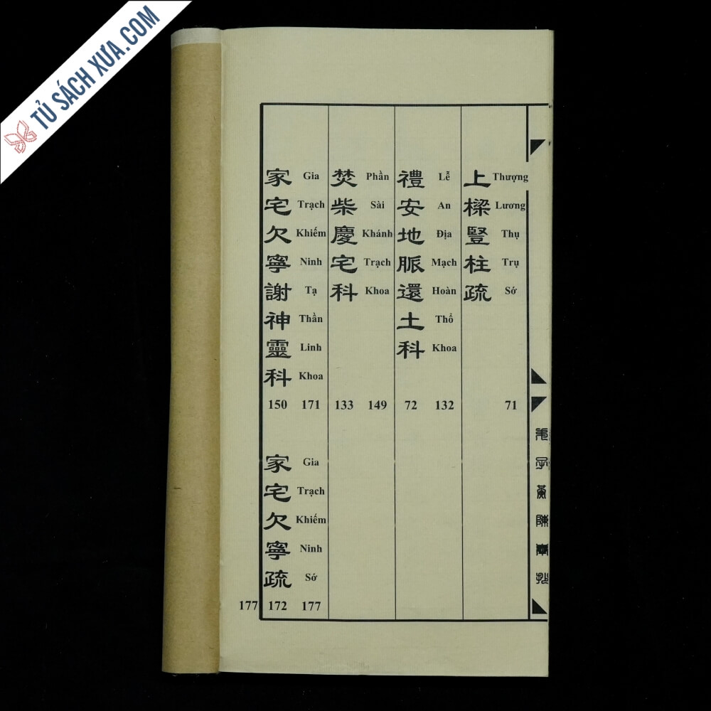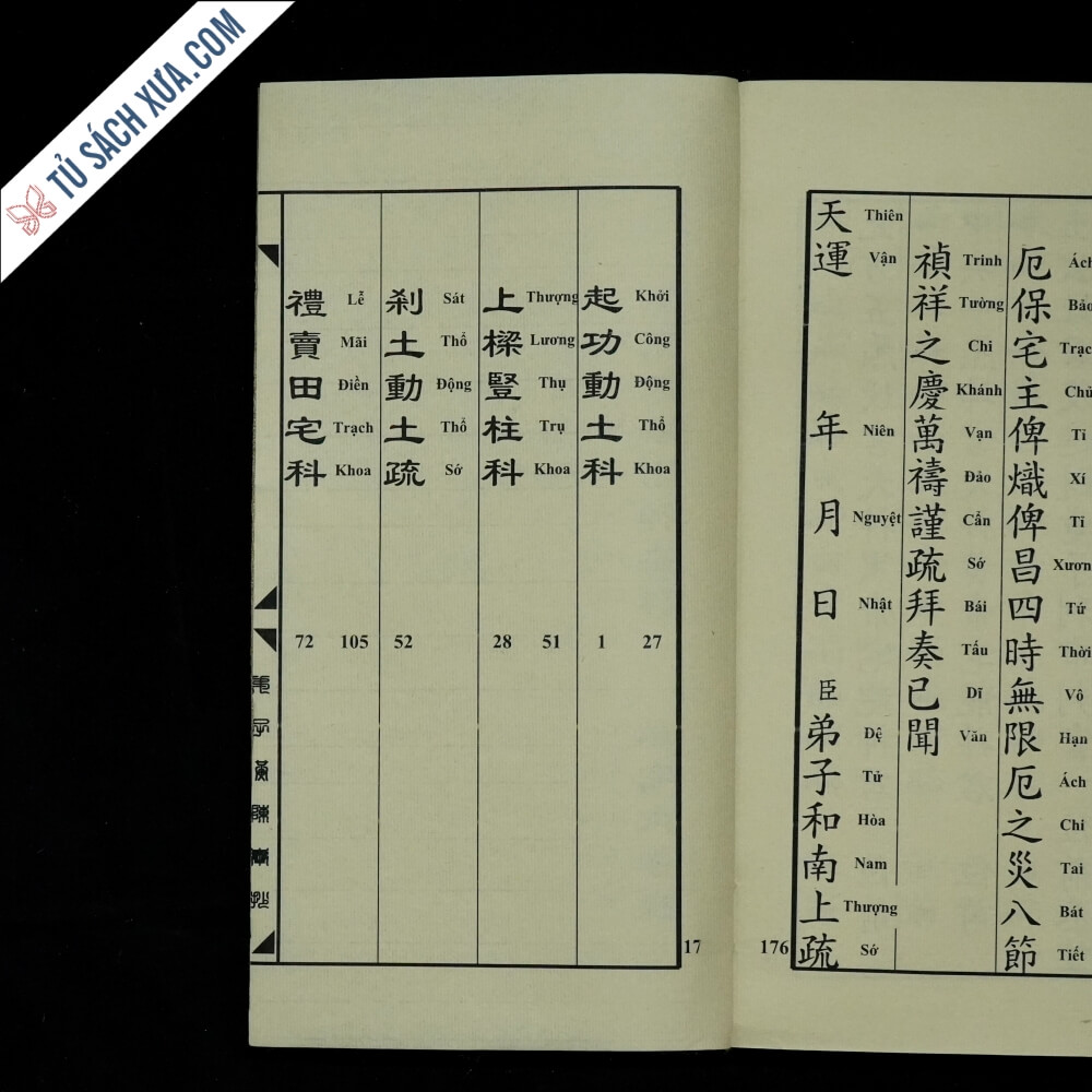 Sách dày 177 trang và được dùng trong nghi lễ động thổ, lên nhà mới bao gồm các khoa cúng và sớ: