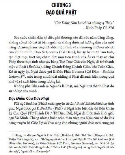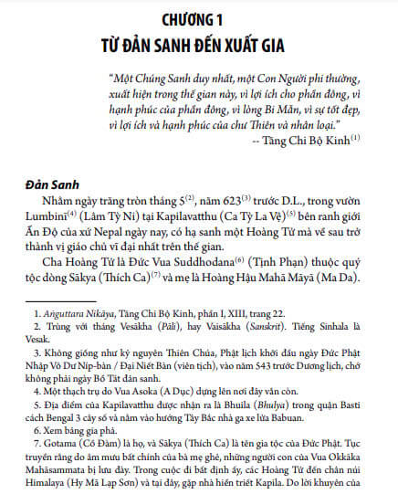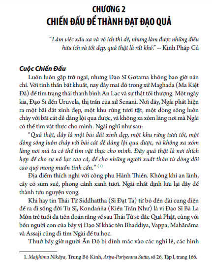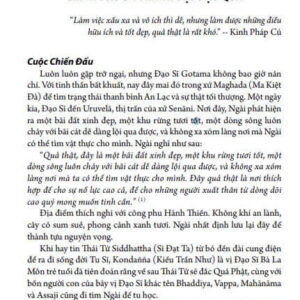 “Hãy tự xem con là hải đảo của con. Hãy tự xem con là nương tựa của con. Không nên tìm nương tựa nơi ai khác”. (trích Trường A-hàm và kinh Đại Bát Niết Bàn, tập 2, trang 100). Tiếp đến tác giả trình bày về quá trình Thái tử chiến đấu để chứng thành Đạo Quả, Đức Phật và thân quyến, Con đường Hoằng pháp, Đời sống hàng ngày của Đức Phật… và cuối cùng là chương Đức Phật nhập Đại Niết Bàn (chương 14).