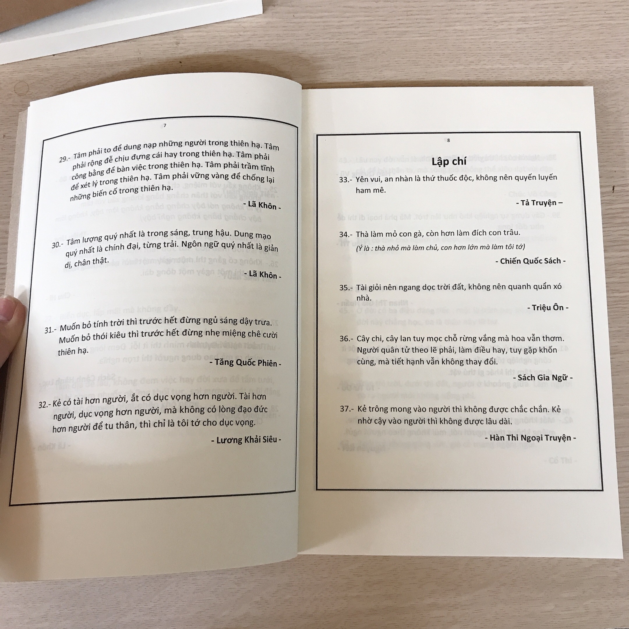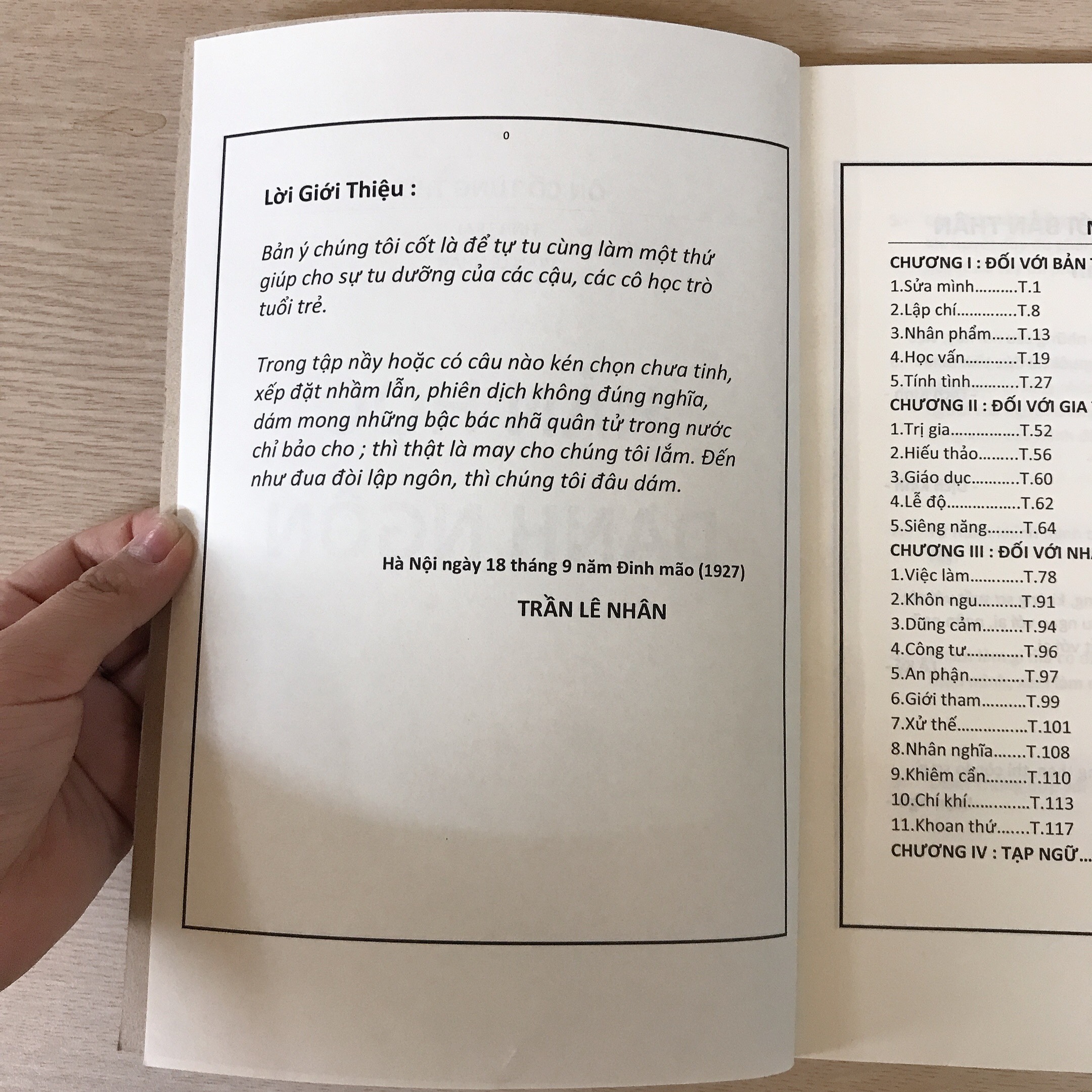 Bản ý chúng tôi cốt là để tự tu cùng làm một thứgiúp cho sự tu dưỡng của các cậu, các cô học trò tuổi trẻ.Trong tập nầy hoặc có câu nào kén chọn chưa tinh,xếp đặt nhầm lẫn, phiên dịch không đúng nghĩa,dám mong những bậc bác nhã quân tử trong nước chỉ bảo cho ; thì thật là may cho chúng tôi lắm. Đến như đua đòi lập ngôn, thì chúng tôi đâu dám.Hà Nội ngày 18 tháng 9 năm Đinh mão (1927) TRẦN LÊ NHÂN