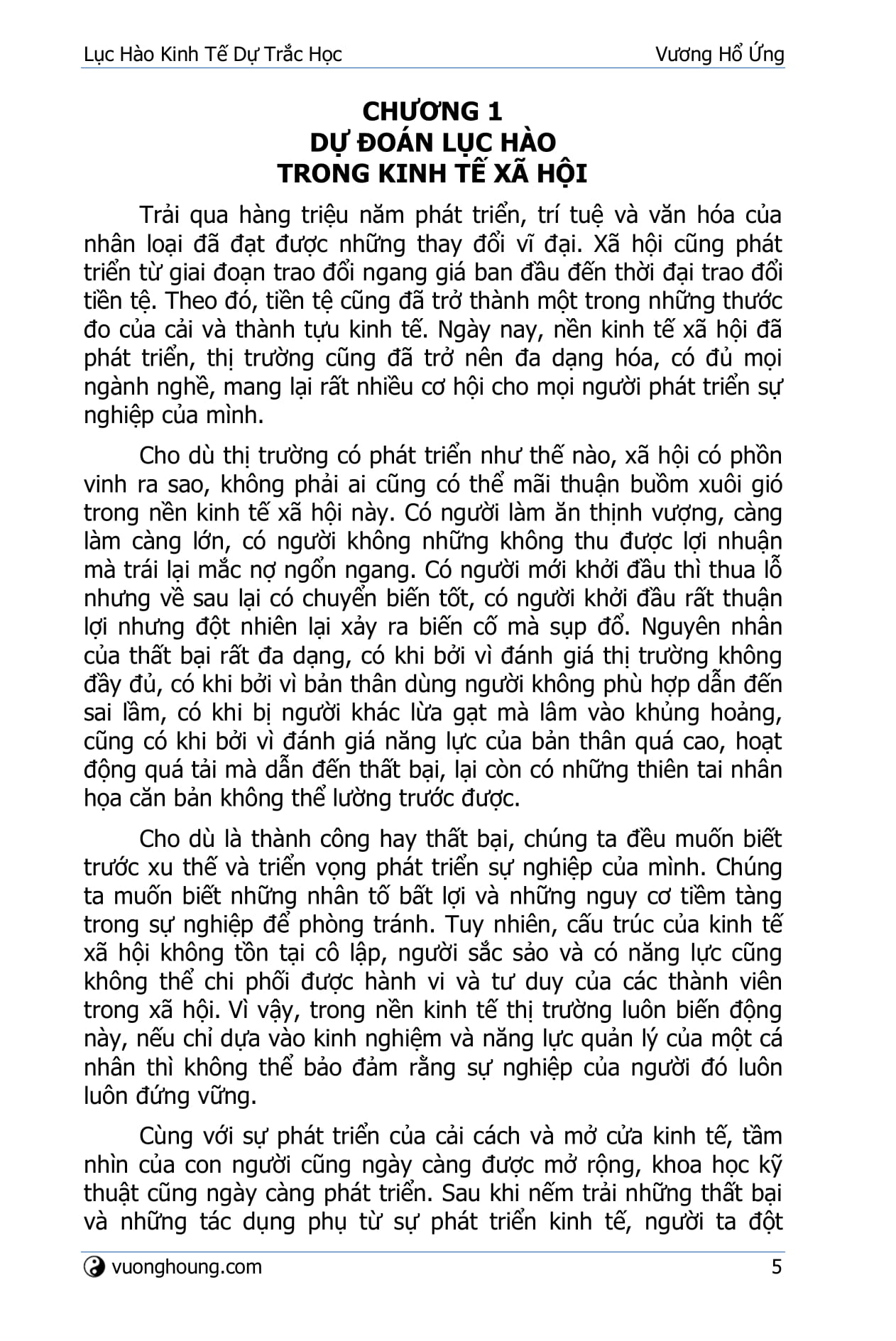 Trong rất nhiều hạng mục dự đoán, dự đoán tài vận và buôn bán kinh doanh chiếm một tỷ lệ rất lớn. Điều đó chứng tỏ rằng tài phú có một vai trò hết sức quan trọng đối với đời sống, nó là một trong những vấn đề chủ yếu mà người ta quan tâm.Tính đa dạng và phức tạp của xã hội hiện đại là những thách thức đối với phương pháp dự đoán được lưu truyền từ thời cổ. Để biết lục hào có thể thích ứng với dự đoán kinh tế hiện đại hay không, chúng ta phải dựa vào những quy luật được phát hiện từ trong thực tiễn và nghiệm chứng tỷ lệ chính xác của nó. Tuy nhiên, người học lục hào chưa chắc đã có nhiều khách hàng đến tìm họ dự đoán, ít có thực tiễn thì không thể nghiệm chứng, càng không thể tổng kết và phát hiện được những quy luật mới. Vì vậy, có không ít người dự đoán cho người khác một cách mù quáng. Dự đoán sai sót là chuyện nhỏ, gây ra tổn thất cho người ta mới là chuyện lớn. Đương nhiên, trong dự đoán thì sai sót là điều không thể tránh khỏi, nhưng chúng ta cũng không nên dùng những kiến thức chưa biết thật giả để dự đoán cho người ta. Cuốn sách này sẽ giúp cho chúng ta nắm bắt được những kỹ xảo trong dự đoán kinh tế, đó cũng chính là tâm nguyện của tôi.