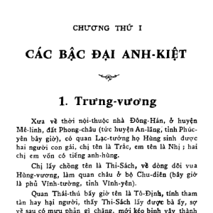 - Chương I: Các Bậc Đại Anh Kiệt (Trưng Vương, Bố Cái Đại Vương, Đinh Tiên Hoàng, Lý Thái Tổ, Lê Thái Tổ, Bắc Bình Vương, Gia Long Đế)