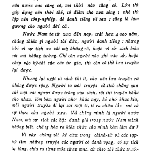 Nhưng lại ngặt vì sách thì ít, cho nên lưu truyền ra không được rộng. Người ta nói truyện cổ tích chẳng qua chỉ một vài người được trông vào sách, ,rồi thì truyền khẩu cho nhau, lõm bõm người nhớ khúc này, kẻ nhớ khúc kia, mỗi người truyền đi lại sai một tí, té ra nhầm lẫn sai cả sự thực của người xưa. Vả chăng mình là người nước Nam, mà sự tích các bậc danh giá trong nước Nam mình không biết, chẳng hóa ra kiến thức của mình kém lắm dư?