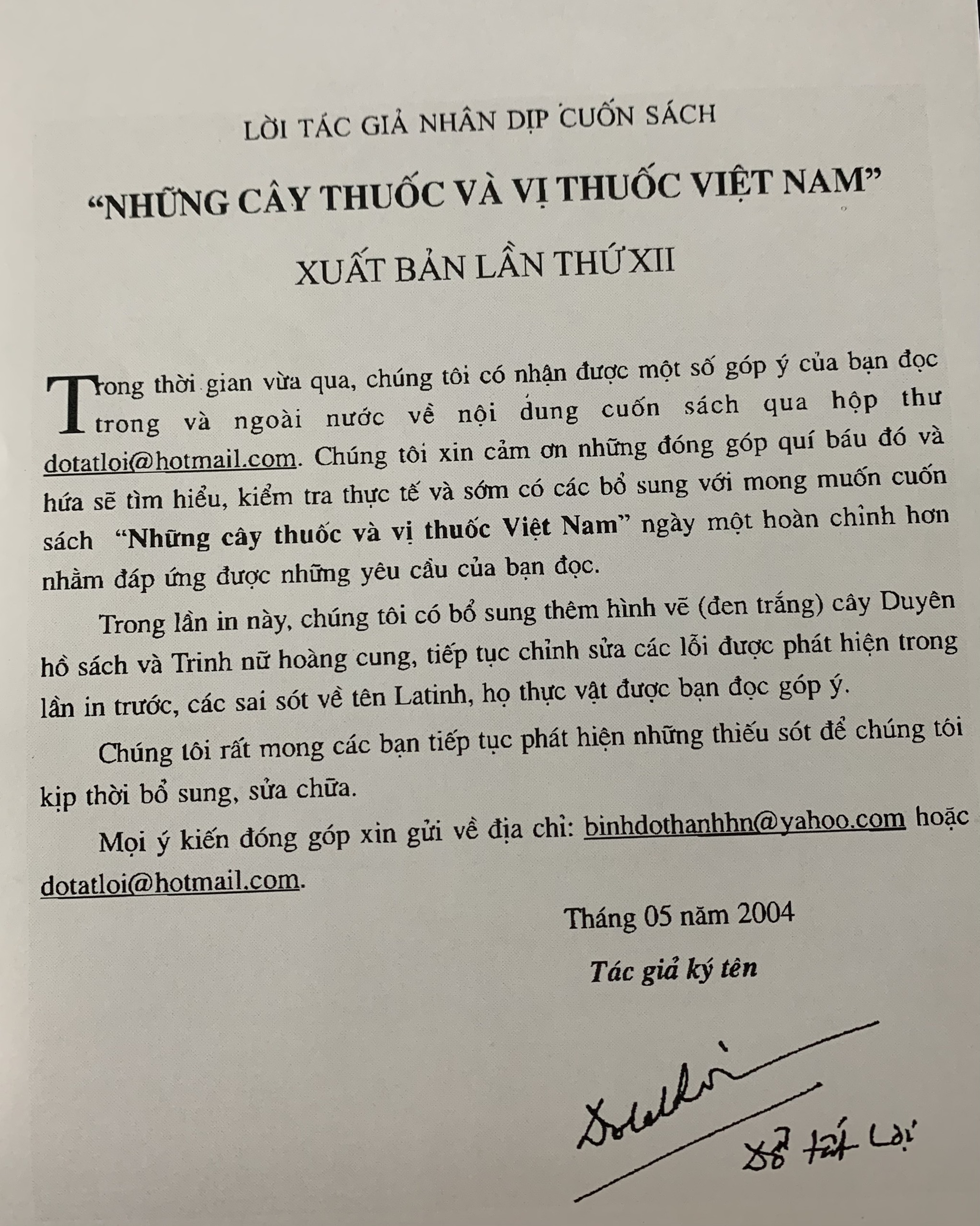 Tôi lấy làm vinh dự được giới thiệu với bạn đọc trong và ngoài ngành y tế cuốn sách “Những cây thuốc và vị thuốc Việt Nam” (xuất bản lần thứ tám), một công trình đã được xếp trong loại giải thưởng cao nhất ở nước ta hiện nay — Giải thưởng Hồ Chí Minh.