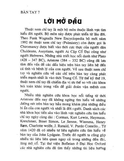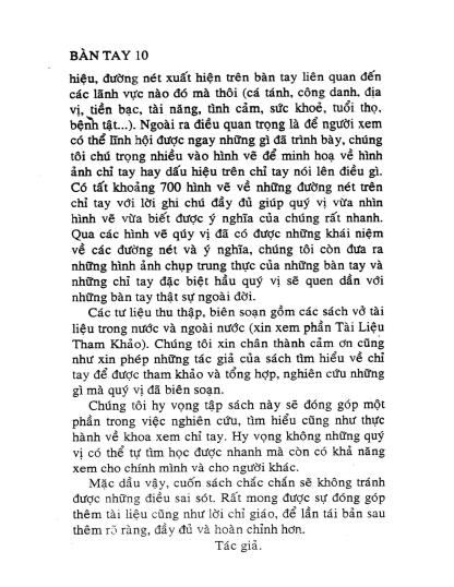 Để giúp độc giả được mau hiểu, mau nhớ khi sử dụng sách. Chúng tôi đã cố gắng rút gọn vấn đề, tránh rườm rà dông dài, chỉ ghi có ý nghĩa của các dấu hiệu, đường nét xuất hiện trên bàn tay liên quan đến các lãnh vực nào đó mà thôi (cá tính, công danh, địa vị, tiền bạc, tài năng, tình cảm, sức khỏe, tuổi thọ, bệnh tật…).