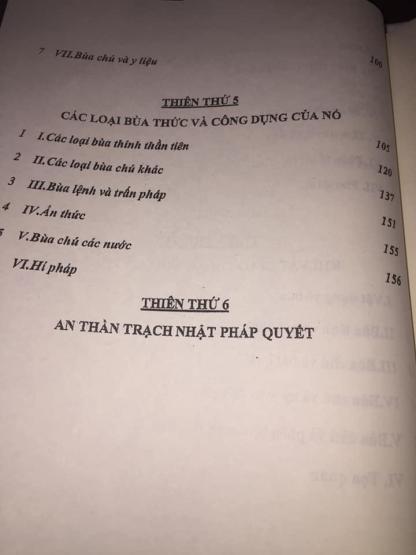 -Thiên thứ năm : các loại bua chú và công dụng của các loại bua, các loại ấn triện và ấn thức trong bua chú, có phần nói về bua chú một số nơi.