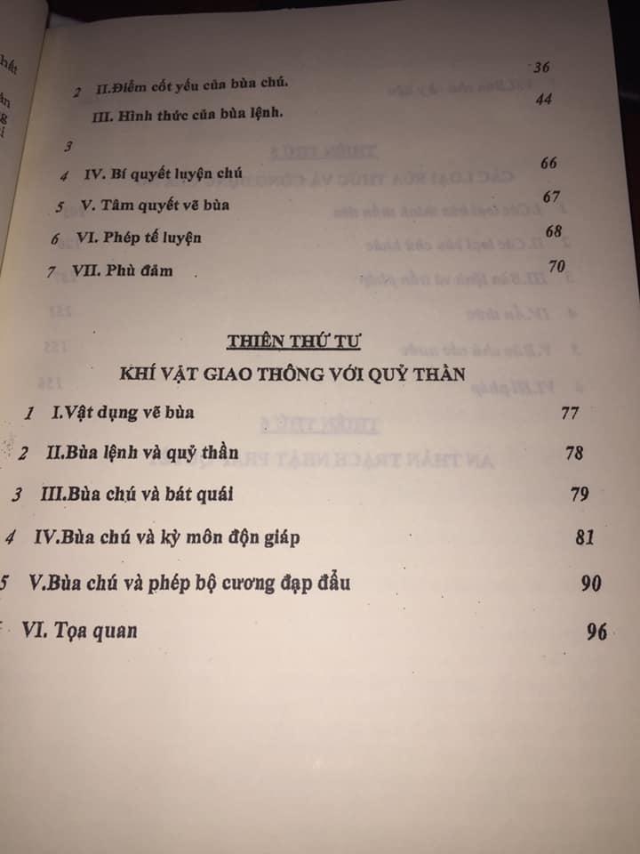 -Thiên thứ tư : khí vật để giao thông với quy thần, vật dụng vẽ bua, liên kết giữa bua và con người và thần thánh, các phép làm kết hợp cùng bua chú.