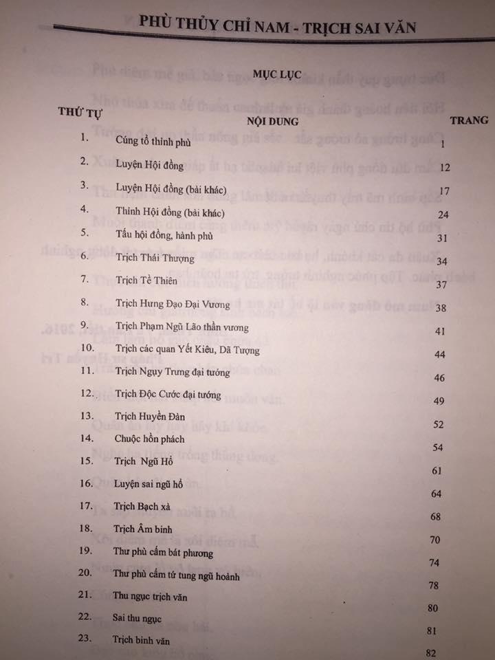 Hơn năm mươi bài văn trịnh sai ở đây, phải nói Phù Thủy Chỉ Nam là sách nằm lòng của các thầy Phù Thủy, vì khi sử dụng thì không ai giở sách ra đọc cả, phải học thuộc để ứng biến trong các đàn lễ.Có cả phép đánh đồng thiếp, nghĩa là vào âm phủ tìm hồn người thân, có cả khoa Luyện ma thần Tầu, các phép sai quan tướng âm binh…