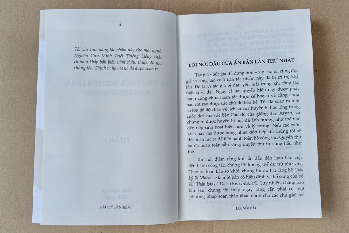 Những chân lý được trình bày dưới đây không mang ý nghĩa như một lời mặc khải; và tác giả cũng chẳng nhận mình là kẻ tiết lộ thiên cơ đầu tiên trong lịch sử. Đó là vì những điều được viết trong tác phẩm này, đã hiện diện từ lâu trong hàng ngàn quyển thánh thư, rải rác ở các tôn giáo khắp từ Á sang Âu. Nó ẩn mình dưới lối viết bằng chữ tượng hình hay biểu tượng, cho nên người đời chưa ai cố công vén lên bức màng ẩn tàng nhiều điều lý thú ấy. Nay, chúng tôi cố gắng thu thập những giáo lý lâu đời nhất, kết hợp chúng lại với nhau và trình bày theo hiểu biết của mình, sao cho mạch lạc nhất. Lợi thế duy nhất mà người viết đã có, là nhận được sự truyền dạy trực tiếp từ các bậc huynh trưởng của mình, chỉ một vài chi tiết là do công tác giả tự tìm tòi nghiên cứu. Việc công bố những kiến thức trong tập sách này, cũng hầu mong trả lại cho môn huyền bí những giá trị chân chính đã thất truyền; vì trong nhiều năm qua, những người theo đuổi nó do đã quá say mê, mà mù quáng tạo nên các suy luận hoang đường mê tín.