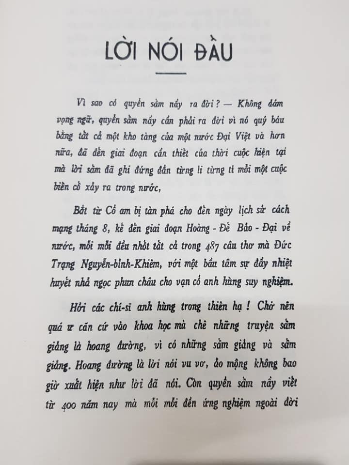 Vì sao có quyển Sấm này ra đời? Không dám vọng ngữ, quyển Sấm này cần phải ra đời vì nó quý báu bằng cả một kho tàng của nước Đại Việt, và hơn nữa đã đến giai đoạn cần thiết của thời cuộc mà lời Sấm đã ghi đúng đắn từng li từng tí những biến cố xảy ra trong nước.Bắt đầu từ Cổ am bị tàn phá cho đến lịch sử cách mạng tháng 8, kế đến là giai đoạn Hoàng Đế Bảo Đại về nước, mỗi mốc đều được ghi trong 487 câu thơ mà Đức Trạng Nguyễn Bỉnh Khiêm, với bầu nhiệt huyết đã nhả ngọc phun châu cho vạn cổ anh hùng suy nghiệm.Hỡi các chí sĩ anh hùng thiên hạ! Chớ nên quá ư căn cứ vào khoa học mà chê những chuyện Sấm giảng là hoang đường, Hoang đường là lời nói vu vơ, ảo mộng không bao giờ xuất hiện như lời đã nói. Còn quyển Sấm này viết từ 400 năm nay mà mỗi điềm đều ứng nghiệm ngoài đời thực, đến cả những tên riêng của những người chủ trương trong mấy phong trào cũng đều ứng nghiệm ghi rõ.