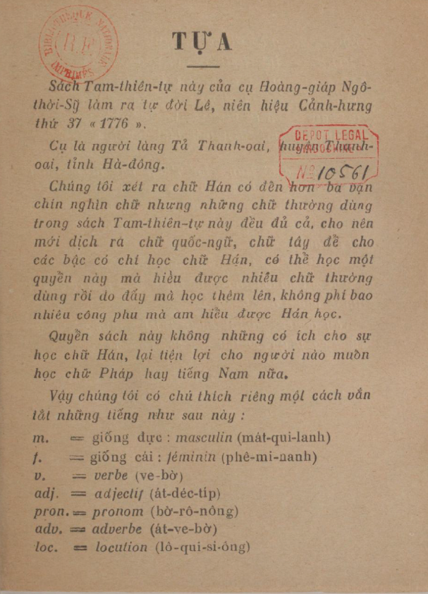 Sách TAM THIÊN TỰ này của cụ Hoàng Giáp Ngô Thời Sỹ làm ra tự đời Lê, niên hiệu Cảnh Hưng thứ 37 – 1776.