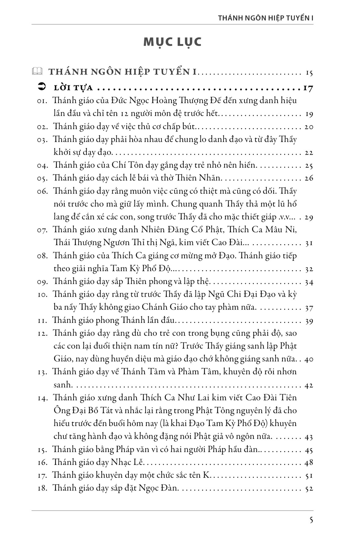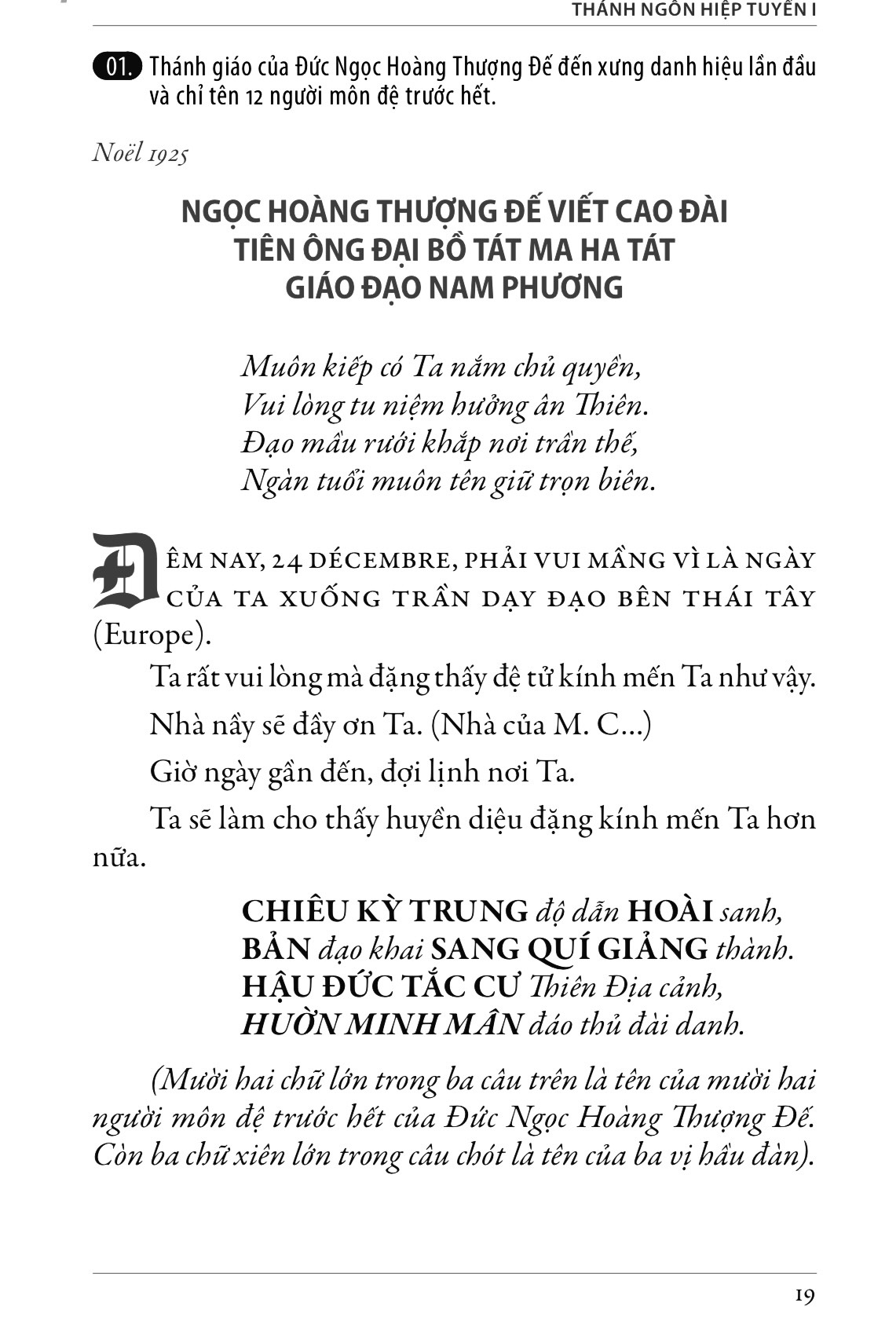 Chư Ðạo Hữu nhập môn trong thời kỳ ngưng cơ bút nầy, không đặng hữu hạnh mà nghe đến lời vàng tiếng ngọc của Ðức Ðại Từ Bi. Nay Hội Thánh nhơn công trích lục những THÁNH NGÔN nào giáng cơ dạy Ðạo, rồi in làm hai bổn, để truyền bá ra cho mọi người thông hiểu. Thiết tưởng, trong Ðạo Hữu, dầu xưa dầu mới, ai có đạo tâm mà tiếp được THÁNH NGÔN nầy lại không hết dạ hoan nghinh.