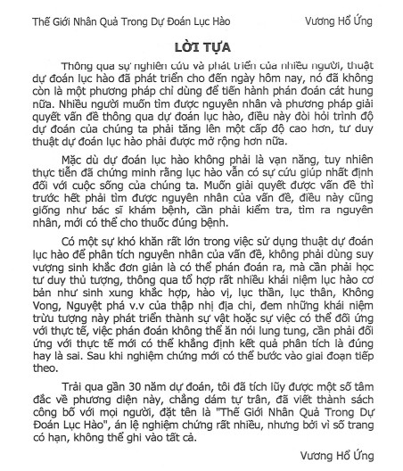Trải qua gần 30 năm dự đoán, tôi đã tích lũy được một số tâm đắc về phương diện này, chẳng dám tự trân, đã viết thành sách công bố với mọi người, đặt tên là “Thế Giới Nhân Quả Trong Dự Đoán Lục Hào”, án lệ nghiệm chứng rất nhiều, nhưng bởi vì số trang có hạn, không thể ghi vào tất cả.