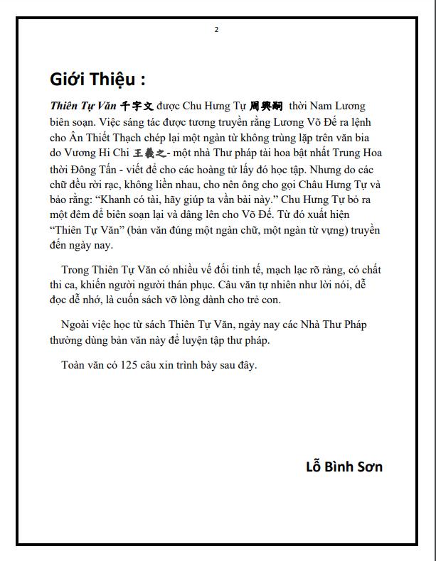 Thiên Tự Văn 千字文 được Châu Hưng Tự 周興嗣 thời Nam Lương biên soạn. Việc sáng tác được tương truyền rằng Lương Võ Đế ra lệnh cho Ân Thiết Thạch chép lại một ngàn từ không trùng lặp trên văn bia do Vương Hi Ch i王羲之 – một nhà Thư pháp tài hoa bật nhất Trung Hoa thời Đông Tấn – viết để cho các hoàng tử lấy đó học tập. Nhưng do các chữ đều rời rạc, không liền nhau, cho nên ông cho gọi Châu Hưng Tự và bảo rằng: “Khanh có tài, hãy giúp ta vần bài này.” Chu Hưng Tự bỏ ra một đêm để biên soạn lại và dâng lên cho Võ Đế. Từ đó xuất hiện “Thiên Tự Văn” (bản văn đúng một ngàn chữ, một ngàn từ vựng) truyền đến ngày nay.