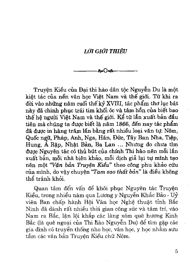 Truyện Kiều của Đại thi hào Nguyễn Du là một kiệt tác của nền văn học Việt Nam và thế giới. Từ khi ra đời vào những năm cuối thế kỉ XVIII, tác phẩm thơ lục bát này đã chinh phục trái tim khối óc và tâm hồn của biết bao thế hệ người Việt Nam và thế giới. Kể từ lần xuất bản đầu tiên mà chúng ta được biết là năm 1866, đến nay tác phẩm đã được in hàng trăm lần bằng rất nhiều loại văn tự: Nôm, Quốc Ngữ, Pháp, Anh, Nga, Hán, Đức,… Nhưng do chưa tìm được nguyên rác có thủ bút của chính thi hào nên mỗi lầ xuất bản, mỗi nhà biên khảo, mỗi dịch giả lại tự mình tạo nên một “Văn bản Truyện Kiều” theo công phu khảo cứu của mình, do vậy chuyện “Tam sao thất bản” là điều không thể tránh khỏi.