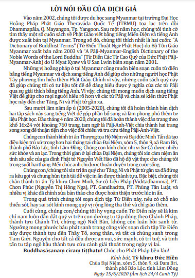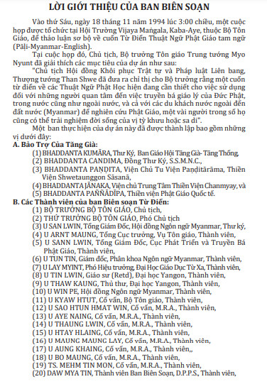 “Chủ tịch Hội đồng Khôi phục Trật tự và Pháp luật Liên bang, Thượng tướng Than Shwe đã đưa ra chỉ thị cho Bộ trưởng rằng một cuốn từ điển về các Thuật Ngữ Phật Học hiện đang cần thiết cho việc sử dụng đối với những người quan tâm đến việc truyền bá giáo lý của Đức Phật, trong nước cũng như ngoài nước, và cả với các du khách nước ngoài đến đất nước (Myanmar) để nghiên cứu Phật Giáo, một vài người trong số họ cũng có thể trải nghiệm đời sống của vị tỳ khưu hoặc sa di”.