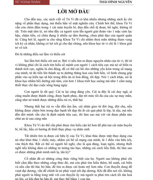 Cho đến nay, các sách viết về tử vi đã có khá nhiều nhưng những sách ấy chỉ nặng về phần thực dụng, mà thiếu hẳn về mặt nghiên cứu. Chính bởi thế, khoa tử vi vẫn còn đắm chìm trong màn huyền bí.