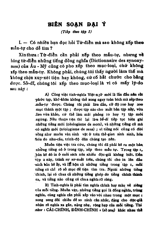 Soạn giả nói: “Muốn có một nền học thuật hoàn mỹ thuần túy Việt Nam, xứng đáng một dân tộc độc lập, quốc văn cần phải như những tiếng của các nước Âu Mỹ, phân minh, rành rọt: tiếng nào nghĩa ấy, mỗi tiếng có một nghĩa riêng, không có tiếng nào thực đồng nghĩa.